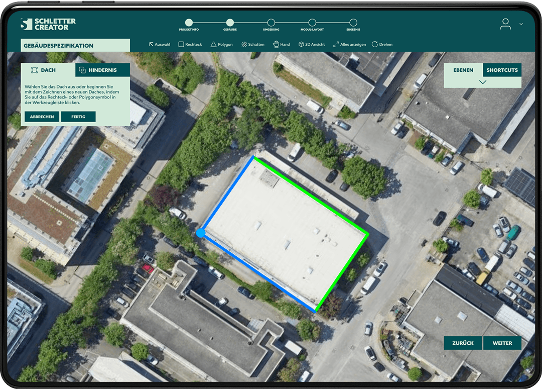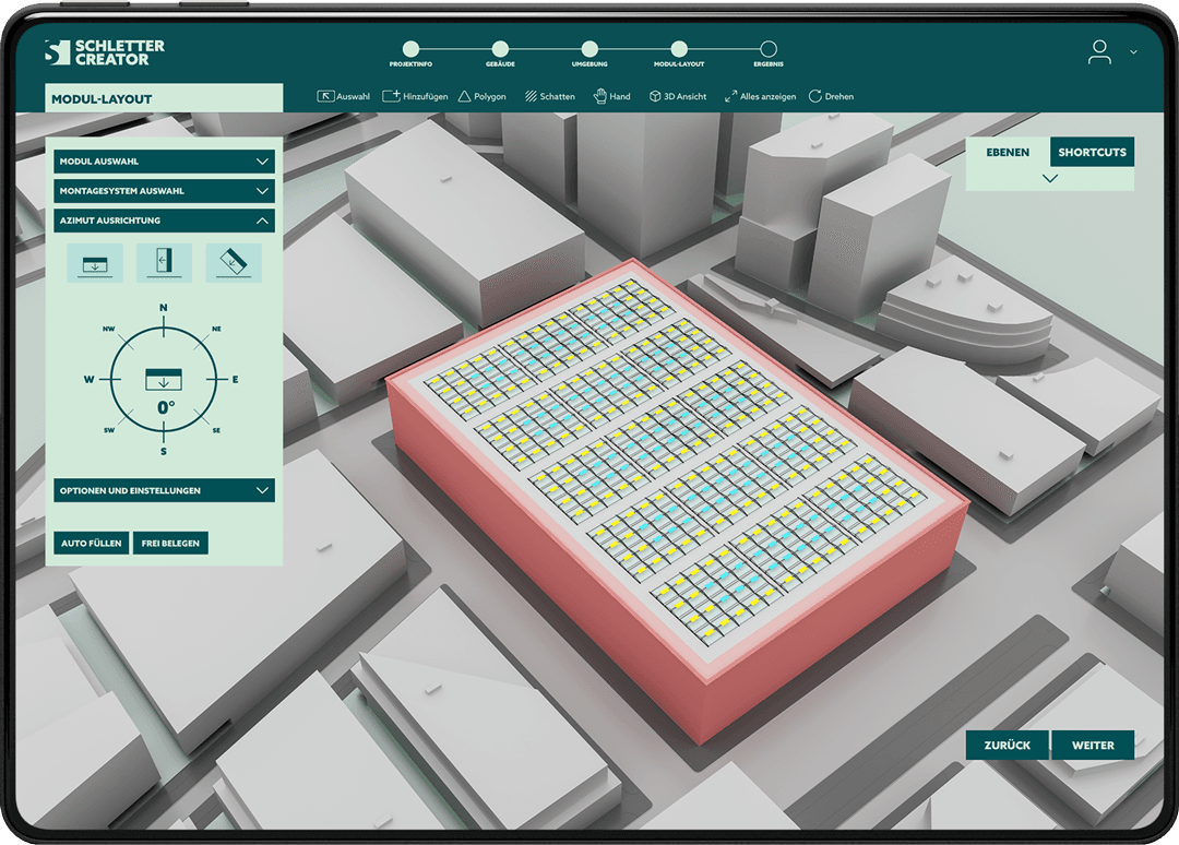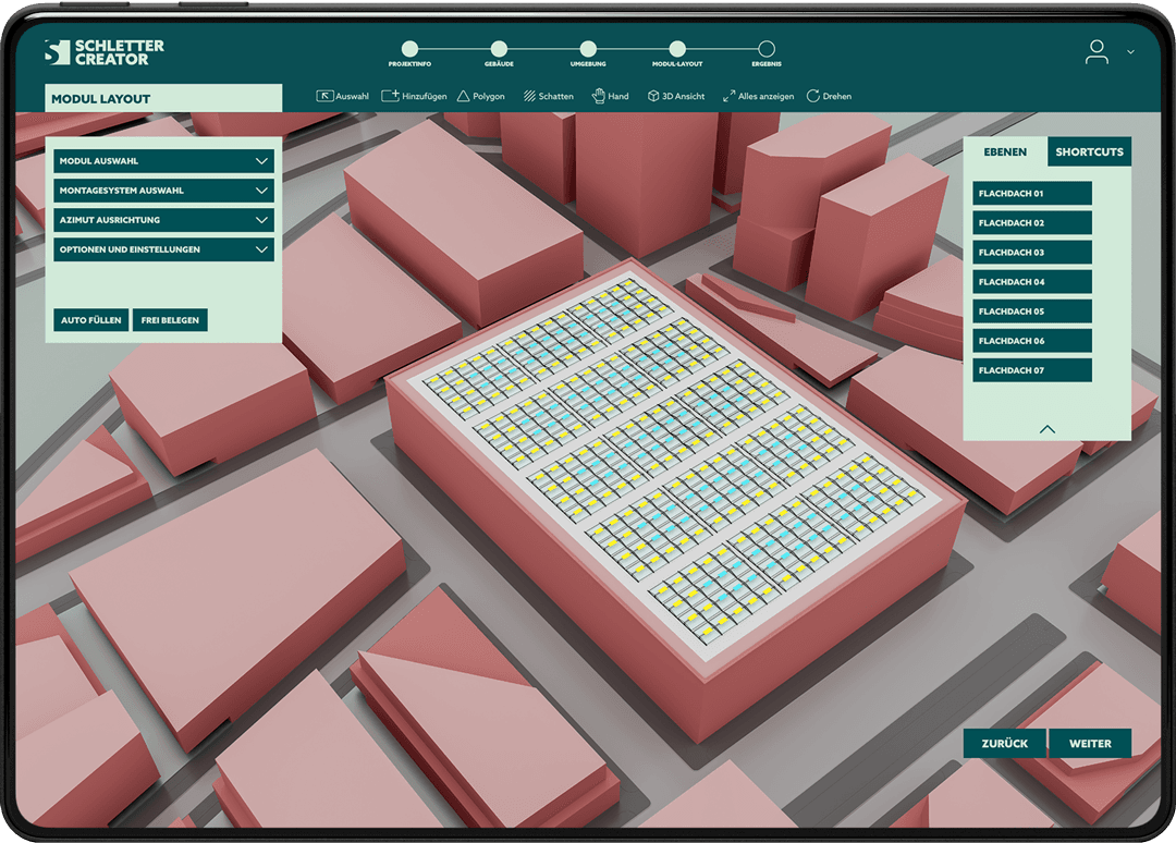 Mit dem Schletter Creator können Sie Ihren Planungsprozess optimieren und auf Basis der weltweit umfangreichsten Datenbank zur Lastermittlung qualitativ hochwertige und belastbare Entwürfe erstellen. So können Sie Ihre Solardachprojekte schneller und einfacher als je zuvor entwerfen, optimieren und visualisieren. Mit der kostenlosen, browserbasierten App, die rund um die Uhr auf jedem Gerät verfügbar ist, sind Zugriff und Nutzung einfach und komfortabel.