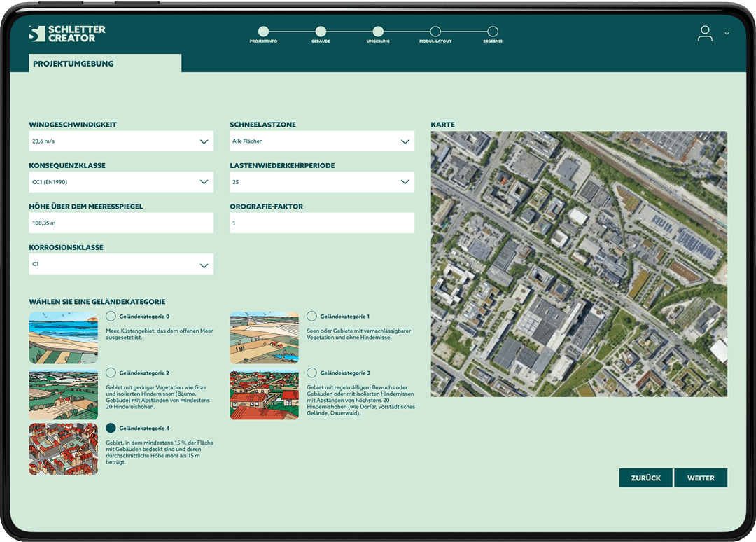 Mit dem Schletter Creator müssen Sie nur ein paar wichtige Informationen eingeben – den Rest erledigt das Programm für Sie. Die Software berechnet die genaue Größe der benötigten Dachfläche und schlägt die optimale Anordnung vor, basierend auf der tatsächlichen Gebäudehöhe, regionalen und ausrichtungsbezogenen Faktoren sowie Daten aus der umfangreichsten globalen Datenbank zur Lastermittlung.