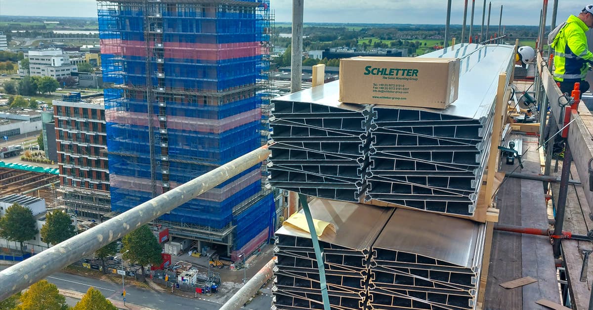 A new city district is being created in the south-east of Amsterdam. As part of the SPOT Amsterdam urban development project, an office-laden location in the Amstel III district is being transformed into a lively and mixed neighbourhood for living and working. Sustainable energy supply is part of the concept, so, in collaboration with the Dutch project developer BLK Projects, Schletter mounting systems are being installed on the striking residential towers of the new district at heights of up to 110 metres.