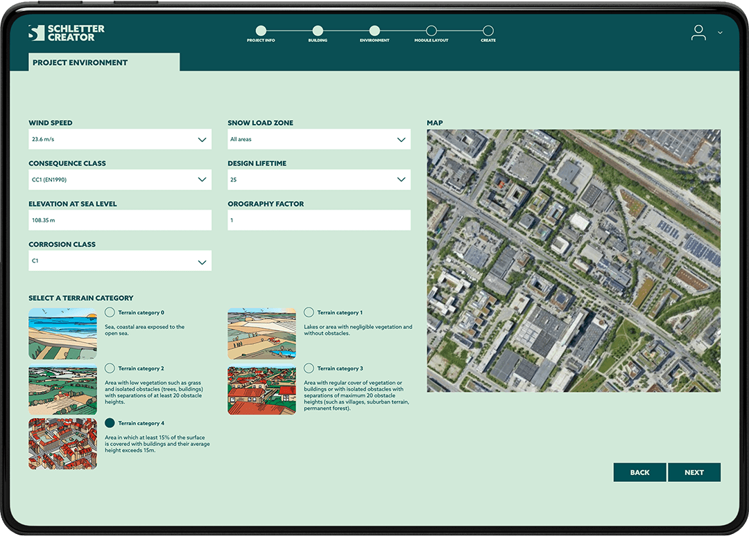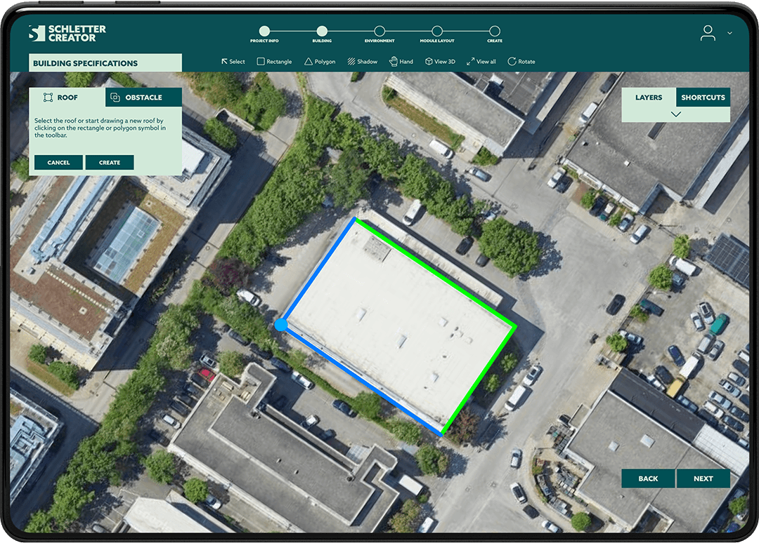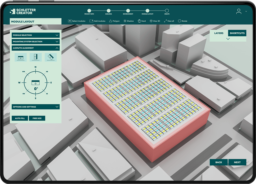 With the Schletter Creator, all you need to do is enter a few key pieces of information and let it do the rest. It’ll calculate the exact dimensions of your required roof area, and suggest the optimal arrangement based on actual building height, regional and orientational factors, and data drawn from the world’s most comprehensive load determination database.