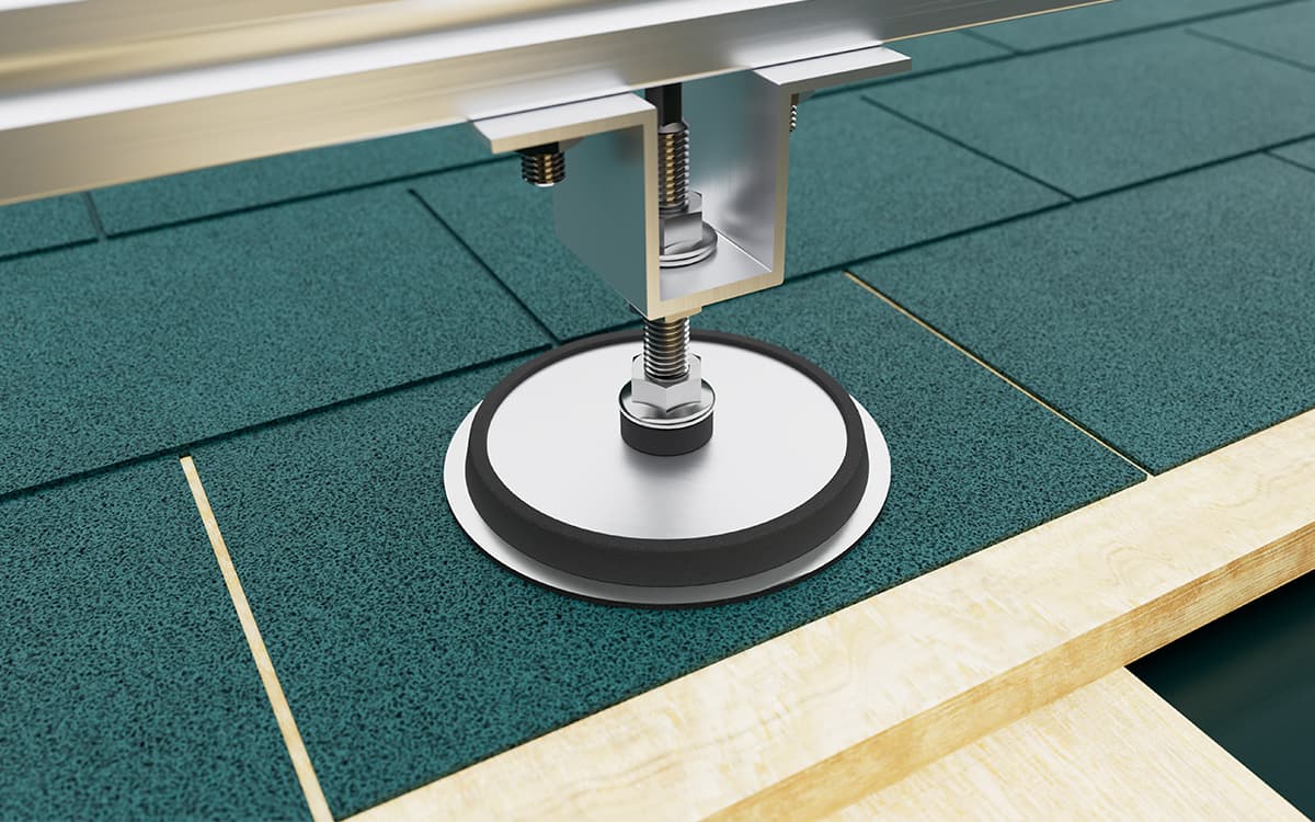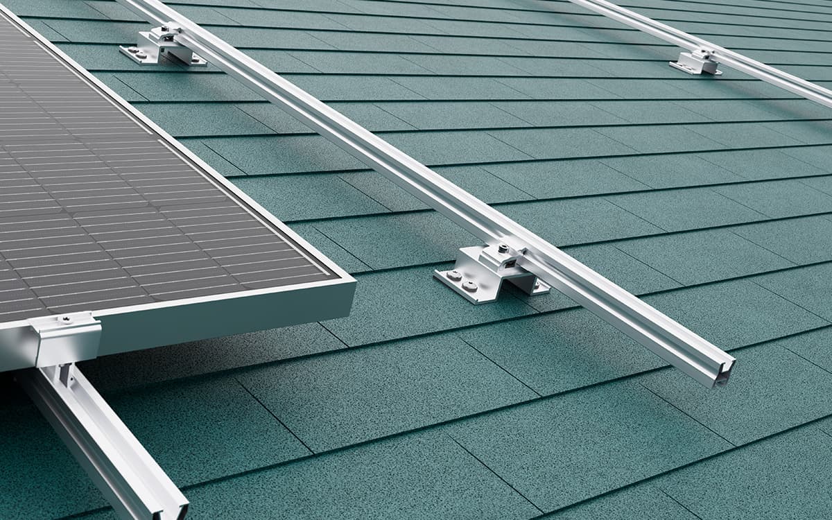 Nos fixations directes facilitent particulièrement l’installation sur les toitures inclinées recouvertes de bardeaux métalliques ou bitumés. On peut les monter par le haut directement dans la charpente sans avoir à retirer les bardeaux, leurs joints EPDM garantissant une étanchéité permanente. Il est également possible d’installer le rail porteur de modules à la verticale ou à l’horizontale, ce qui offre une liberté totale pour créer la configuration idéale.
